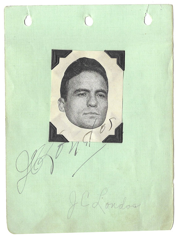 LONDOS, J.C. (1897-1975) Greek American professional wrestler. Known as The Golden Greek. One of the most popular stars in professional wrestling from the 1920’s to the 1940’s. First immigrant to be an athletic superstar in the United States. He was the highest drawing star in wrestling. He once defeated Bronco Nagurski. Inducted into the Pro Wrestling Hall of Fame (2002). On a vintage album page is affixed a portrait of Londos. He has started to sign his name on the page and the last three letters of his name runs into his portrait. Genuine signatures of Londos are rather scarce...........................$145.00![]() |