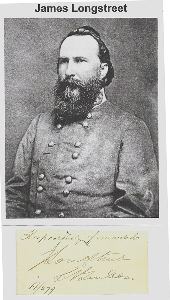 LONGSTREET, James (1821-1904). Confederate Lieutenant General who distinguished himself at Bull Run, Fredericksburg and Chickamauga. Excellent signature with two word sentient and rank: “Respectfully forwarded J. Longstreet Lt.Genl H/279.” In very fine condition................$850.00![]() |