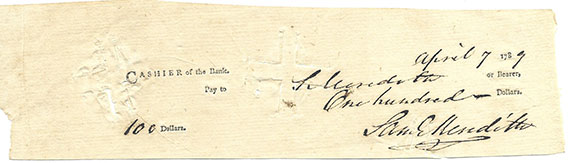 MEREDITH, Samuel (1741-1817). First treasurer of the United States under a U.S. President. Philadelphia financier and a General in the American Revolutionary War. He fought in several major battles, Trenton, Princeton, Brandywine and Germantown. Partly printed document signed. Check filled in by Meredith “Cashier of the Bank” April 7, 1789. Pay to S. Meredith and signed once again. “X” cancellation not affecting his very bold signature. In exceptionally fine condition.............$295.00
