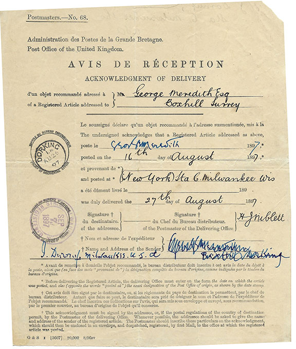 MEREDITH, George (1828-1900). English poet, writer. Document signed, 1pg. 16 August 1897. Large Post Office form from the U.K. Partly printed, filled in by a clerk. Also partly filled in by Meredith and signed in full. Most interesting....$125.00![]() |