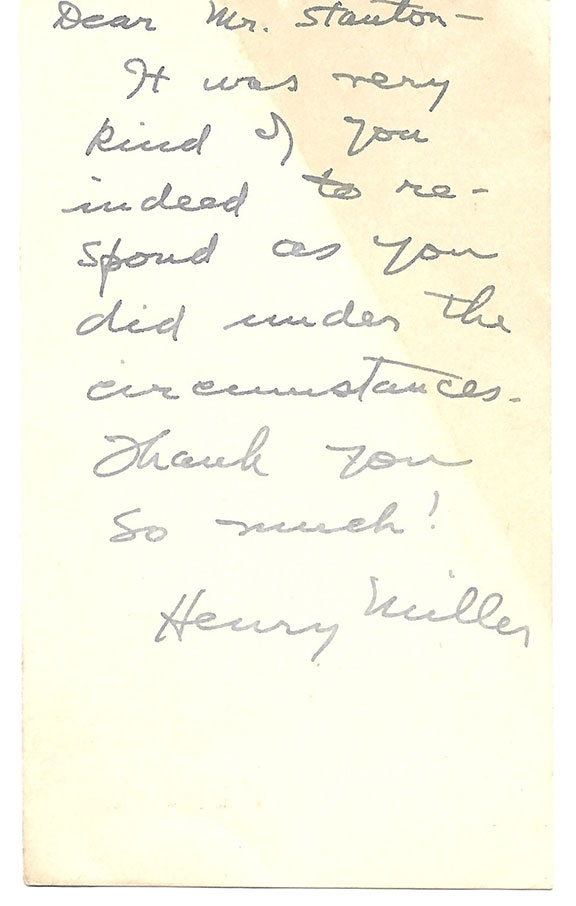 He is known as the Father of the Beat Generation of writers. Miller led a bohemian existence that he write about in his novels; Tropic of Cancer (1934), Black Spring (1936), and Tropic of Capricorn (1939). These three books were prohibited in the United States on grounds of obscenity. They were frequently smuggled into this country building Henry Miler an underground following. Autograph letter signed, one page on the verso of a postcard postmarked May 17, 1955 to Mr. Herbert E. Stanton, Delray Beach, Florida. Miller writes: “Dear Mr. Stanton, It was very kind of you indeed to respond as you did under the circumstances. Thank You so much! Henry Miller.” In fine condition with light toning to half of the left side of the postcard.............$225.00
