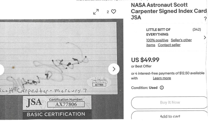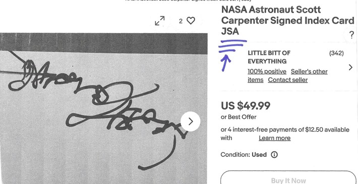 The following illustration is said to be a genuine signature of astronaut Scott Carpenter. The genius who thoroughly examined this autograph is a person (you'll never know who) called an "expert" at JSA. See illustration below.