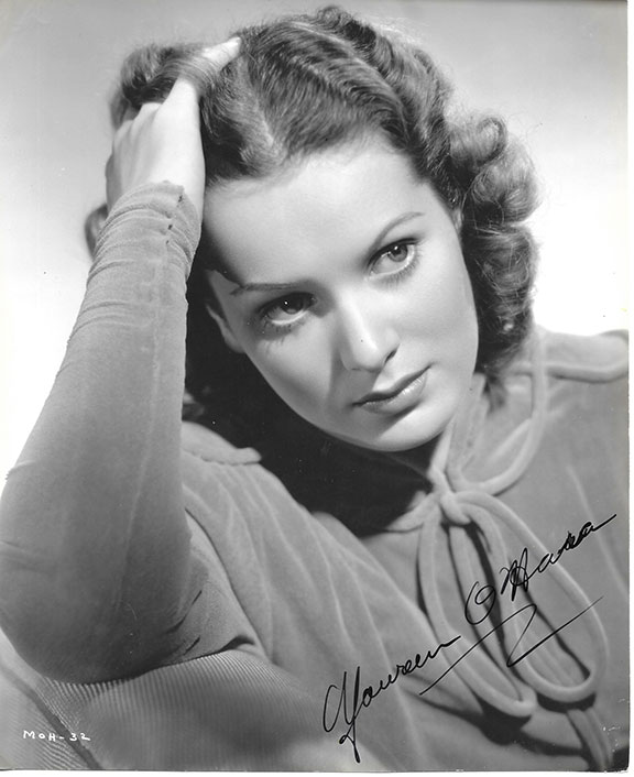 OHARA, Maureen (1920-2015). Irish American actress and singer. Made her first film with John Wayne. She was presented an Honorary Academy Award (2014). She is known as the “Queen of Technicolor.” Lovely Bachrach photograph, copyright 1939. Head and shoulders pose looking quite serious, 7.75”x9.5” boldly signed. From the Vernon Hansen collection. In near fine condition...........................$95.00![]() |