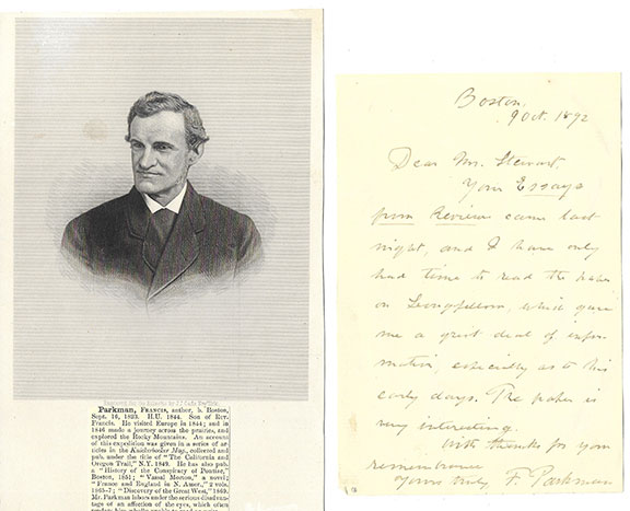 PARKMAN, Francis (1823-1893). American author, historian, lived with the Dakota Indians, best known for writing The Oregon Trail. Elected to the American Hall of Fame in 1915. A.L.S., one page, Boston, 9 oct. 1892. To Mr. Stewart. In part: “Your Essays from Review came last night and I have only had time to read the paper on Longfellow which gave me a great deal of information...” F. Parkman. In fine condition with engraved portrait...........................$157.50![]() |