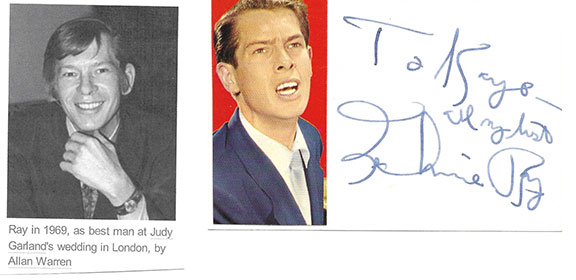 RAY, Johnnie (1927-1990). American singer, songwriter, actor. Cited by critics as The Father Rock and Roll. In 1954 his first film “There’s No Business Like Show Business” included Marilyn Monroe in the cast. He was a sensation in the 50’s and influenced many acts including Elvis. He was known for his animated stage antics. He was a prime target for teen hysteria in the pre-Presley days. Ray was basically deaf in both ears. Some of his many hits were: Walkin My Baby Back Home, Just Walkin In the Rain, You Don’t Owe Me a Thing, I’ll Never Fall in Love Again, As Time Goes By, Ain’t Misbehavin, and Who’s Sorry Now. For years Ray had a close relationship with Dorothy Kilgallen. Ringo Starr said of the three singers he listened to was Johnnie Ray. Ray served as best man at Judy Garland’s wedding. Ray was bi-sexual and was arrested for soliciting an undercover officer at The Brass Rail, a gay bar. Ray’s scarce inscription, two word sentiment and signature: ”To Kaye all my best Johnnie Ray” on a 3”x4.5” card. Affixed is a color portrait of Ray on the left side of the card. A very fine example ..................$137.50