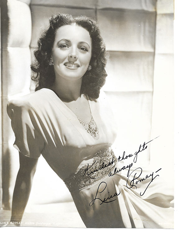 ROMAY, Lina (1919-2010). Mexican American actress, singer with Xavier Cugart during the early 40’s. She had a fifteen year career as a film actress. A vivacious brunette she starred with Rita Hayworth and Fred Astaire. Appeared in numerous films. Attractive, Metro Goldwyn-Mayer image, half length pose, smiling, 7.5”x9.5”. Boldly signed with a three word sentiment: “Kindest thoughts always Lina Romay.” From the Vernon Hansen collection. In fine condition..........................$75.00![]() |