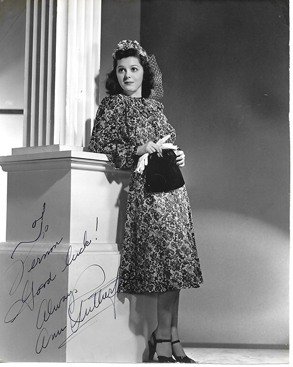 RUTHERFORD, Ann (1917-2012). Canadian American actress in film, radio and TV. She played the part of Careen O’Hara in GWTW (1939). She is a Hollywood legend. Choice photograph of an elegant Rutherford, full length wearing a cotton B&W print which was her choice in the warm summer days. Vintage photograph, B&W, 7.5”x9”. Inscribed and signed: “To Vernon Good Luck! Always Ann Rutherford.” From the Vernon Hansen collection. An uncommon image. In fine condition...........................$85.00