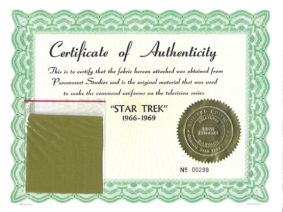 SHATNER, William (1931- ) Canadian actor, author, singer, producer and director. Best known for his role as Captain James T. Kirk in Star Trek from 1966-1969. He is presently suffering from a blood sugar issue. Color photograph, 8”x10” head and shoulders pose as Captain Kirk. Together with a large swatch, 3”x3” of authentic Star Trek uniform fabric from the original television series. The fabric is affixed to a Certificate of Authenticity that certifies this fabric was obtained from Paramount Studios and is the original material that was issued to make the command uniforms on the television series Star Trek 19661969. Limited No.00299. Affixed is the large seal of Movie Exchange, California Limited Edition, Hollywood. Along with this collection is a scarce vintage 3”x5” card signed William Shatner. These three wonderful items would make a fine ensemble for framing. All in mint condition .............$295.00
