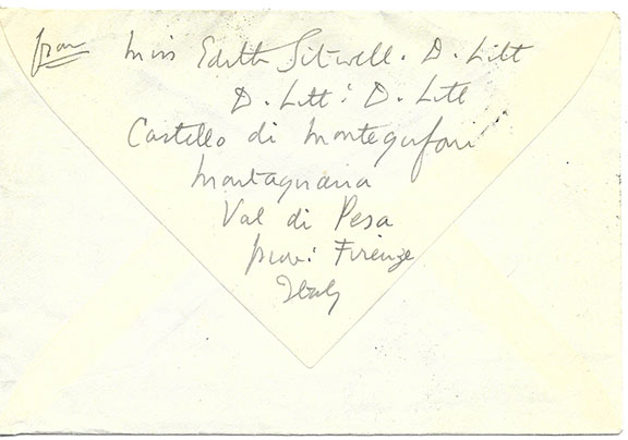 SITWELL, Dame Edith (1887-1964). English poet, novelist. Envelope addressed to her friend Monroe Wheeler at the Brown’s Hoel Dover Street , London. Three Italian postage stamps cancelled Firenze 15/10//52. On the verso she has signed her name as “Miss Edith Sitwell” and added a six line return address. Monroe Wheeler was the noted author and Director of Exhibitions of the Metropolitan Museum of Art in New York. In fine condition...........................$87.50![]() ![]() |