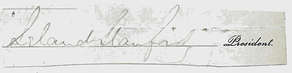 STANFORD, Leland (1824-1893) Civil War Governor of California. American tycoon, one of the founders and president of the Central Pacific Railroad. Founder of Stanford University. Very good signature “Leland Stanford” as President of the Central Pacific Railroad. Signature cut from a document. A rather uncommon signature ..........
