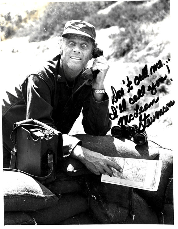 STEVENSON, McLean (1927-1996). American actor and comedian. Best remembered for his role as Lieutenant Colonel Henry Blake in the TV series M*A*S*H. One episode included the death of Henry Blake. He won a Golden Globe Award in 1974. He was second cousin to Adlai Stevenson. Very scarce 8”x10” portrait of Stevenson on the telephone in a military situation holding a map. His facial expression is looking as he is in shock. A scarce six-word sentiment boldly signed “Don’t call me... I’ll call you!” McLean Stevenson.”  Light wear at top left corner otherwise in very good condition ..........