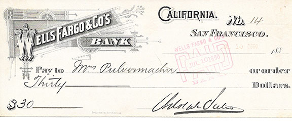SUTRO, Adolph (1830-1898). Born to a Jewish family in Germany. He became a mining engineer and politician. Served as the 24th Mayor of San Francisco. He designed and constructed the Sutro Tunnel for the Comstock Lode in Virginia City, Nevada. Choice bank check on the San Francisco, California Wells Fargo & Co for $30 made payable to Mrs. Pulvermacher. Check exhibits a Bank/Paid stamp dated July 10, 1890. No cancellation marks touch Adolph Sutro’s magnificent signature. In very fine condition..........$187.50