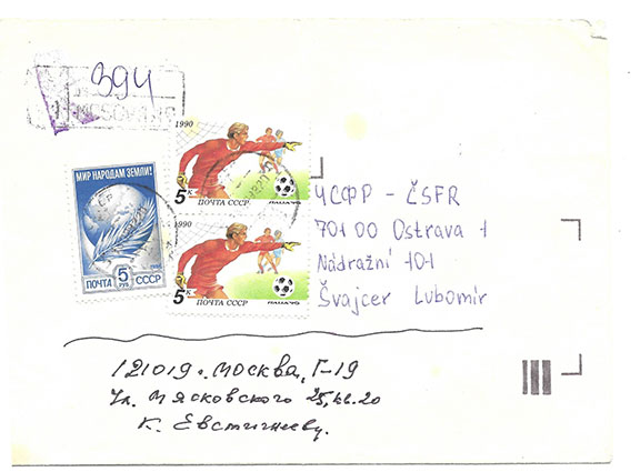 YEVSTIGNEYEV, Kirill USSR Fighter pilot during WWII. Two times Hero of the USSR. Fifth top scoring fighter pilot with a credit of 52 victories. Russian envelope bearing three Russian postage stamps cancelled circa 1984. The Ace has signed his name and has written his return address. Hand addressed to a collector in Czechoslovakia. In V/G condition. A very desirable autograph...........$250.00![]() |