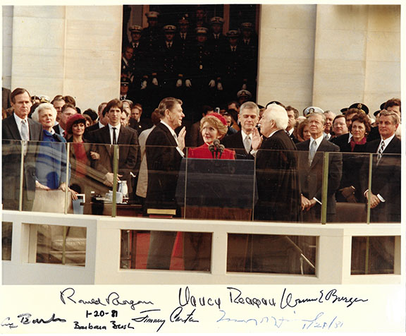 REAGAN, Ronald (1911-2004). Ameican politican and actor. He served as the 40th President of the United States (1981-1989). Very rare, one of a kind historic Official Photograph, The White House, Washington signed. An image of Ronald Reagan being sworn in as the nation’s 40th President. Oblong 10"x8" signed and dated by Reagan on the lower light margin using a black ink pen. In addition also signeing the photograph is Nancy Reagan, George H.W. Bush, Barbara Bush, Jimmy Carter, Warren E. Burger and Senator Mark O. Hatfield 1/20/81. Hatfield was Chairman of the Reagan Inaugural Committee. Written on the verso:"All signatures on this photograph personally obtaine by Senator mark O. Hatfield of Oregon. Senator Hatfield was also Chairman of Reagan’s inaugural Committee. This photograph was signed at the request of Stephen Koschal of Verona, New Jersey. Jimmy Carter autographed this photograph at Mark Hatfield’s house. Warren E. Burger signed this photograph two weeks later while having lunch with Senator Hatfield.V/P Bush autographed this photograph in his office in the Capitol Building after having lunch with Senator Hatfield and Stephen Koschal in the Senate Cafeteria. Note: I was shocked to see a photograph of Ronald Reagan on a side table in the Bush office that was inscribed to Bush by a secretary and signed with an Autopen signature. This photograph hand signed by seven is in fine condition. In January 2003 a Florida Autograph Gallery sold a similar photograph, which only had a sentiment signed by Ronald Reagan and dated Jan 20, 1981 sold for $3,500.00. Our price for this museum piece. $5775.00