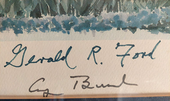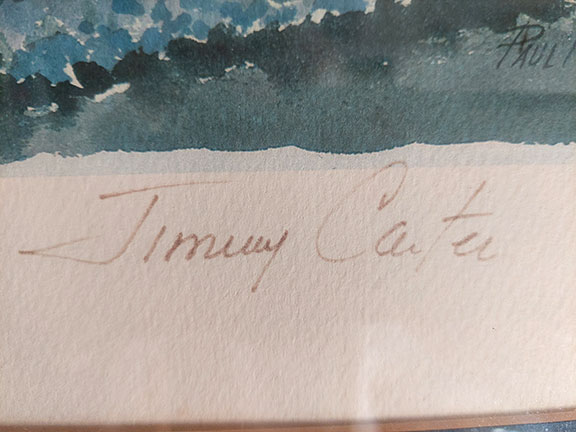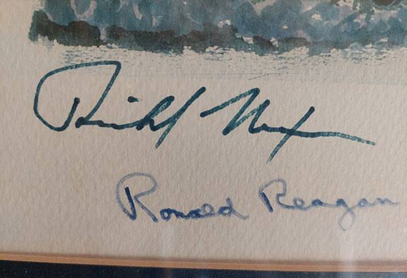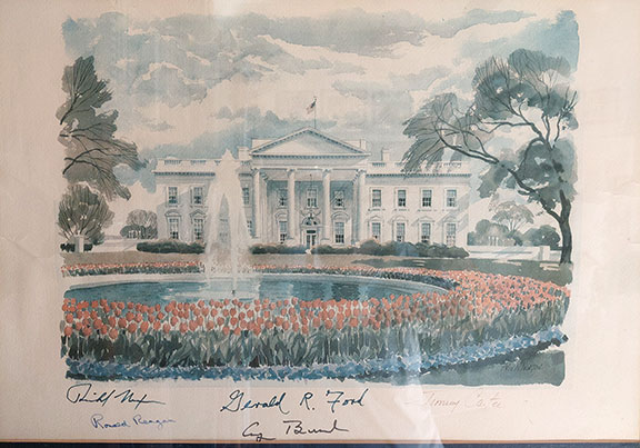 NIXON, Richard, FORD, Gerald, CARTER, Jimm, BUSH, George and REAGAN, Ronald. Very attractive lithograph, in color of The White House and its gardens filled with tulips and a fountain. Signed in print by the noted and prestigious artist Paul N. Norton. His paintings can be found in The White House, U.S. Capitol, and Iowa’s Governor’s Mansion and more. He is remembered as a “Master of the Familiar.” In addition, he created the logos for Dairy Queen and Pella Windows. He painted over 500 watercolors, and many were reproduced by the thousands for the public eager to own his artwork. In 1981, he had an audience with Ronald Reagan while presenting the original watercolor of this lithograph. Measures appx. 18”x24” signed by the five presidents with full signatures. Some light wrinkling in the clear left and right margins that can be either matted out or steamed out. There is plenty of room for more signatures. A quite impressive item.