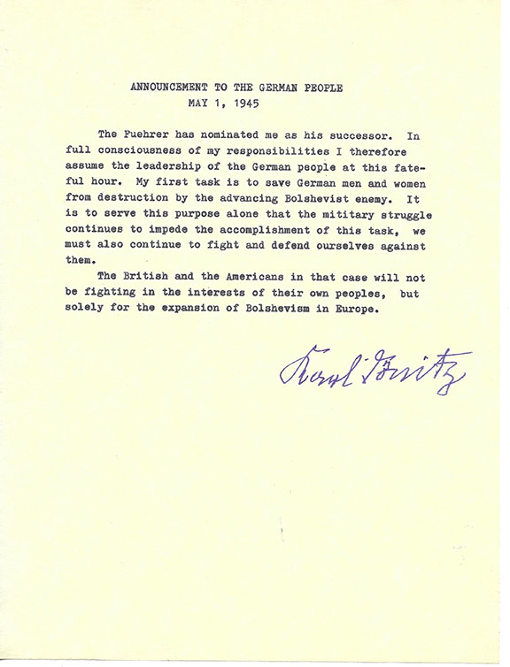 DONITZ, Karl (1891-1980). German Grand Admiral, commander of the U-Boat fleet. On May 2, 1945 Donitz succeeded Hitler as Reich Head of State and Supreme Commander of the Armed Forces. He ordered Alfred Jodl to sign the German Instrument of Surrender in Rheims, France. Donitz signed the Allied terms for Nazi Germany’s unconditional surrender on May 8, 1945. Donitz was found guilty of crimes against peace and served 10 years in prison. Donitz is best remembered for his 23-day term as president of Germany after Hitler’s suicide. Typed document in English signed, “Announcement To The German People, May 1, 1945. The Fuehrer has nominated me as his successor. In full consciousness of my responsibilities, I therefore assume the leadership of the German people at this fateful hour. My first task is to save German men and women from destruction by the advancing Bolshevist enemy. It is to serve this purpose alone that the military struggle continues to impede the accomplishment of this task, we must also continue to fight and defend ourselves against them. The British and the Americans in that case will not be fighting in the interests of their own peoples, but solely for the expansion of Bolshevism in Europe.” Typed on parchment style paper, a wonderful souvenir of this WWII historical document from a man who surrendered his country. Documents of this type are rarely seen on today’s market especially with the desirable full signature of Karl Donitz. In V/F to Mint condition. $1275.00
