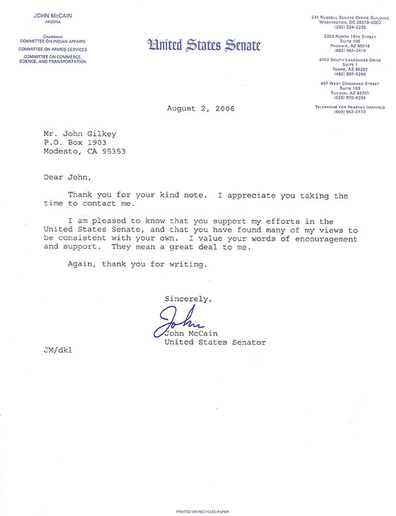 a) A typed letter signed “John” on United States Senate letterhead dated August 2, 2006. A nice letter of appreciation of support of McCain’s efforts in the Senate….”and that you have found many of my views to be consistent with your own. I value your words of encouragement and support. They mean a great deal to me….”