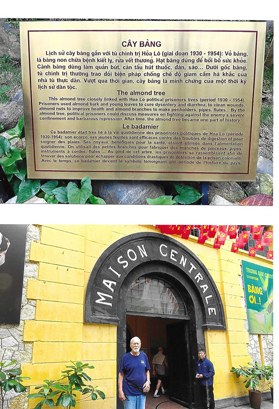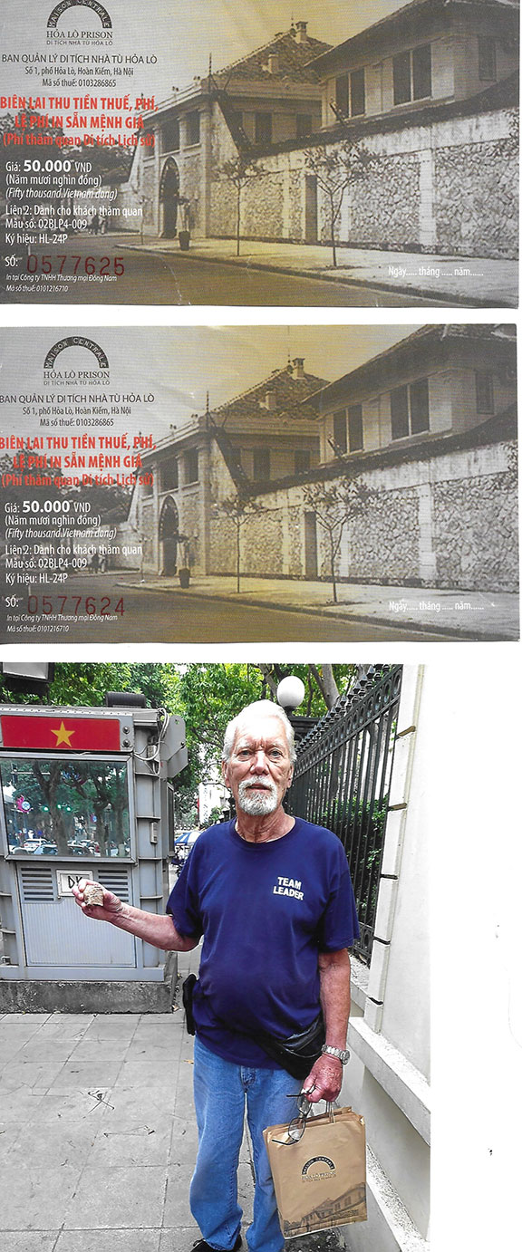 f) A photo of Steve Koschal holding this piece of brick outside Hoa Lo Prison.