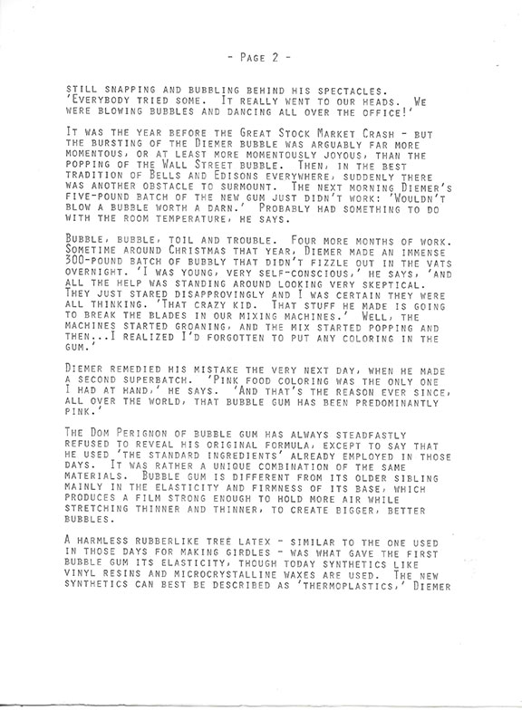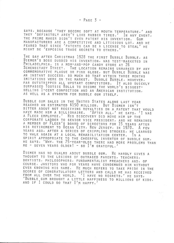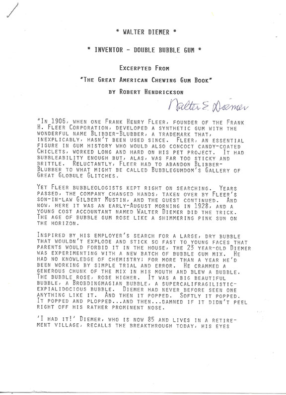 DIEMER, Walter (1905-1998). Accountant with Fleer Corporation who for more than a year was researching by trial and error to discover a dry bubble that wouldn’t explode and stick to faces of kids. During August 1928 he accomplished his goal. Some months later he made a 300 pound batch but it had no color. The very next day, he made a super batch and the only coloring he had was “Pink Food Coloring.” He added this and that is why bubble gum is predominately pink. The day after Christmas 1928 the first Double Bubble was tested and marketed in a Philadelphia mom and pop candy store at 26 Schenectady Street. The gum became an instant success and quickly surpassed Tootsie Rolls to become the world’s number one best selling 1-cent confection. His discovery moved him up the corporate ladder to Senior Vice President and he remained on the Board of Directors for fifteen years after his retirement in 1970. Typescript, 3 pages from The Great American Chewing Gum Book, Walter Diemer Inventor Double Bubble Gum. Very interesting story on how Diemer accomplished his invention. Signed by Walter Diemer on page one. “Diemer has no qualms about bubble gum. He hardly gives a thought to the legions of outraged parents, teachers, dentists, philosophes, fundamentalist preachers and, of course janitors who for years have condemned him...” Would look great framed with a slice of gum from a pack of cards. Super collectible for a sports card collector. In very fine condition. $250.00