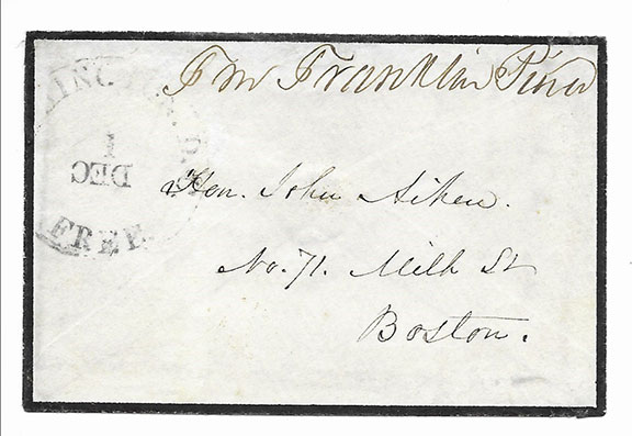 POLK, Sarah (1803-1891). First Lady, widow of President James K. Polk. Free frank signature “Free Sarah Polk”, on a mourning envelope addressed in her hand to Maj. Wm. H. Polk, Columbia, Tennessee. A dark ink hand stamp at left corner “Nashville, TN, Aug.11” and “Free” handstamp. Intact black wax seal on verso. Collector’s note along front left corner of the cover.