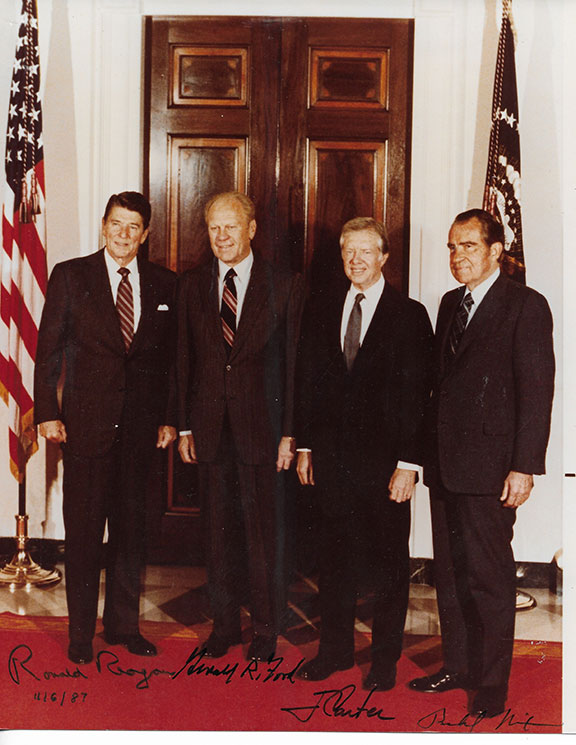SUPERB Signed Color Photograph of 4 Presidents Who Assembled At The White House Before Departing for Egyptian President Sadat’s Funeral NIXON, Richard (1913-1994). 37th President of the United States (1969-1974).