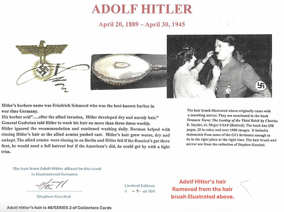 HITLER, Adolf (1889-1945). German politician, leader of the Nazi Party. Chancellor of Germany (1933-1945). Fuhrer of Germany (1934-1945). He initiated WWII in Europe. Committed suicide in his Berlin bunker by a gunshot to his head. He was only 56 years old. Our latest Limited Edition Collector’s card. Card 8, in Series #3 of 100 numbered and hand signed collector’s cards created by Stephen Koschal. A very attractive card stock card measuring 8.5”x11”, printed in color and contains a strand of hair from Hitler’s sterling silver, monogrammed hair brush. In mint condition and rare.
