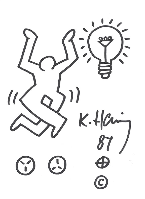 HARING, Keith (1958-1990) American graffiti artist of the 80’s. Diagnosed with Aids in 1988. Unusually large original sketch, using a wide black Sharpie pen, measures 8”x11.5” of his famous “Radiant Baby: in a joyous mode alongside a light bulb as if the baby is getting a great idea. Signed and dated “K. Haring, 87” with three addition symbols and a copyright notice. Most unusual and quite uncommon in this large format. In very fine condition and ready for framing.