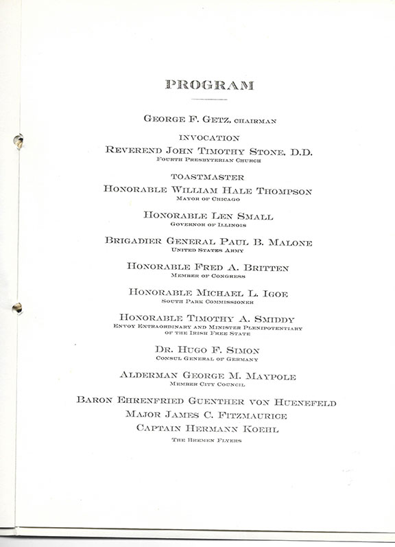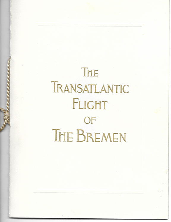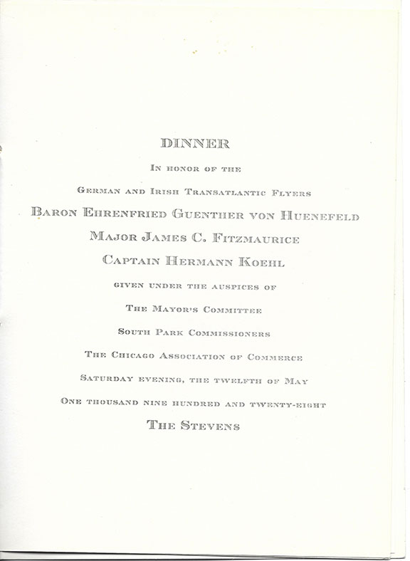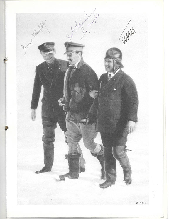 When they landed in Canada they were lost. Floyd Bennett flew to their aid but was stricken with pneumonia and died. New York City gave the three pioneers a huge ticker tape parade. Beautifully printed program and menu 7”x10” tied with a cord. Printed by Marshall Field & Co. This program honored their flight. The first page contains a portrait of the three aviators dressed in their flight gear. All three have signed above their portraits. Page two is about the aviators, dinner and date 12 May 1928. The third page is the Program. Would frame very well. Most unusual to have all three sign on the same piece. A historic treasure. The signature of the baron is quite scarce as he dies at the early age of thirty-seven. In very fine condition.