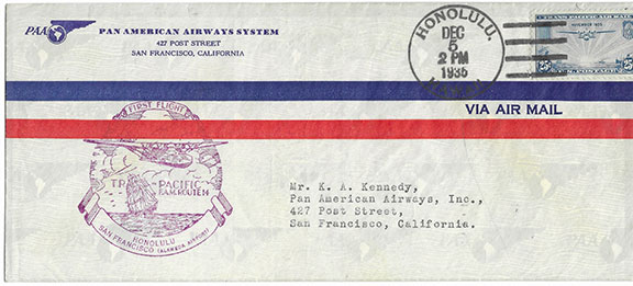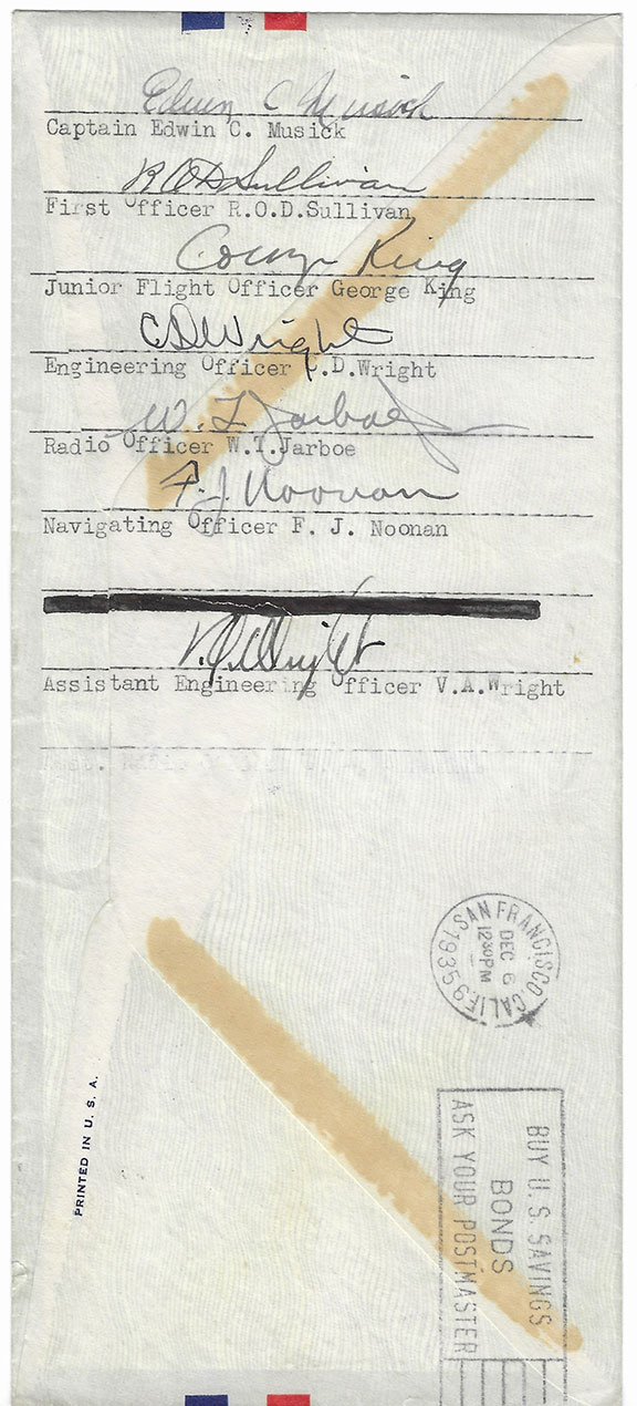 Very Rare First Flight Cover Honolulu-San Francisco Signed by the crew including the world’s most famous pilot at the time,and F. Noonan who disappeared with Amelia Earhart