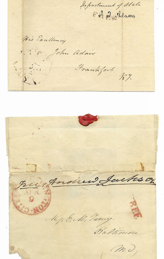 Two Official covers from Lincoln’s two private secretaries, John Nicolay and John Hay. For either the Lincoln collector or the postal history collector, this is a historic pair of covers. Both covers are “From the President of the United States. The first cover has a fine free franking signature “John Nicolay” with a Washington, D.C. January 6th (1862) postmark. Addressed to Jos H. Bradley Esq., 81 Madison Avenue, New York. N.Y. to the left of the postmark interestingly John Hay has signed his name adding the date “Jany 8th 1862.” Perhaps he was the one that actually mailed this item. On the reverse, Nicolay has 90% of his presidential wax seal still visible.