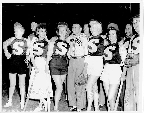 Remarkable photograph, 8”x10” oblong of a very young Sinatra with his celebrity baseball team all dressed in uniform. Everyone is looking at the camera except for Ava Gardner who is holding a baseball bat and looking directly at Frank Sinatra having a very pleasing smile. In addition, also in this photograph is Betty Grable and Virginia Mayo and Phil Silvers. Circa 1946.