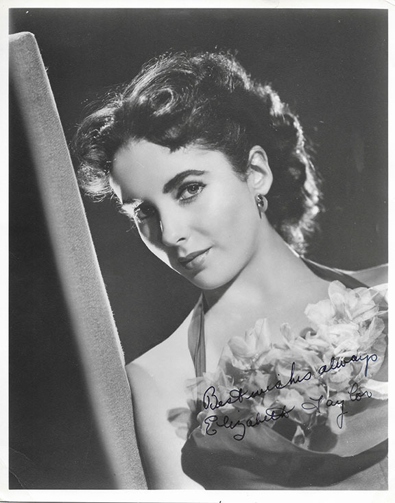TAYLOR, Elizabeth (1932-2011) British-American actress who began her career as a child actress in the early 1940’s. She was one of the most popular stars of classical Hollywood. She was married 8 times to seven men and converted to Judaism. Taylor became the highest paid movie star during the 1960’s. She assembled one of the most expensive private jewelry collections in the world. Gorgeous vintage photograph of the young actress, head and shoulders pose looking quite serious. One of the earliest signed photographs of Taylor to appear on the market. Rare, not inscribed to an individual but contains a three word sentiment. Vintage signed photographs of Taylor of this caliber are very scarce. A truly stunning portrait of this young actress with a 3 word sentiment signed: "Best wishes always Elizabeth Taylor." Boldly signed with a fountain pen. Light creasing on three corners otherwise in very fine condition.