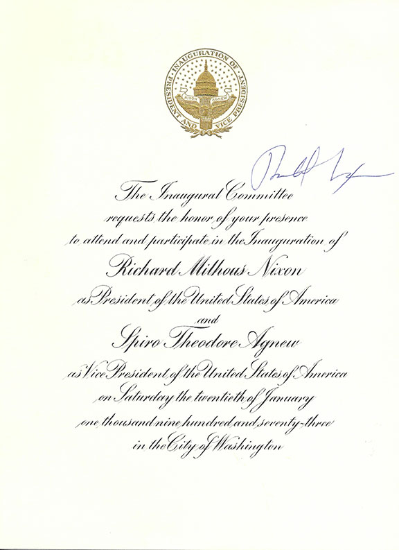 12) NIXON, Richard (1913-1994). 37th President of the United States (Jan 29, 1969-Aug 9, 1974). Fabulous original Invitation to attend the Inauguration of Richard Milhous Nixon as President of the United States. Measures appx. 8”x11” and signed by Richard Nixon near the gold embossed seal of The Inauguration. A choice specimen...........$775.00 |