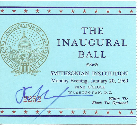 14) NIXON, Richard (1913-1994). 37th President of the United States (Jan 29, 1969-Aug 9, 1974). First President to resign the Office of President. Ticket stub #2252, to The Inaugural Ball, The Smithsonian Institution, Monday Evening, January 20, 1969, Washington, D.C. signed “R. Nixon” hastily, as president. V/F condition. From the Senator Mark O. Hatfield collection...........$275.00 |