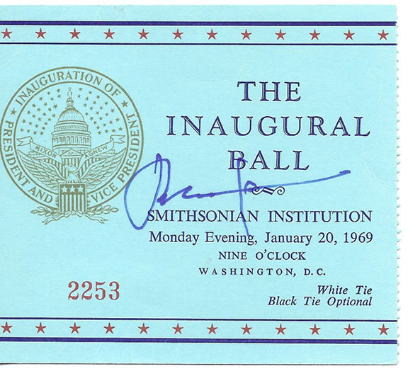 15) NIXON, Richard (1913-1994). 37th President of the United States (Jan 29, 1969-Aug 9, 1974). First President to resign the Office of President. Ticket stub #2253, to The Inaugural Ball, The Smithsonian Institution, Monday Evening, January 20, 1969, Washington, D.C. signed “R. Nixon” hastily, as president. V/F condition. From the Senator Mark O. Hatfield collection...........$275.00 |