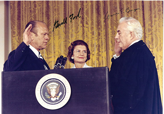 19) FORD, Gerald R. (1913-2006) President of the United States (1974-1977) and BURGER, Warren E. (1907-1995). 15th Chief Justice of the United States (1969-1986. Rare and Historic Photograph Signed, "Gerald Ford" and "Warren E. Burger". An 8 in. by 10 in. oblong color photograph of Gerald Ford being sworn in as President of the United States by Chief Justice Warren Burger in the aftermath of Richard Nixon’s resignation. With Betty Ford between them, Chief Justice Burger swears in President Gerald Ford following the resignation of President Richard Nixon. This is the only photograph of Gerald Ford being administered the Oath of Office we have ever seen signed by both Burger and Ford. Ideal for framing. In fine condition ..................................$950.00