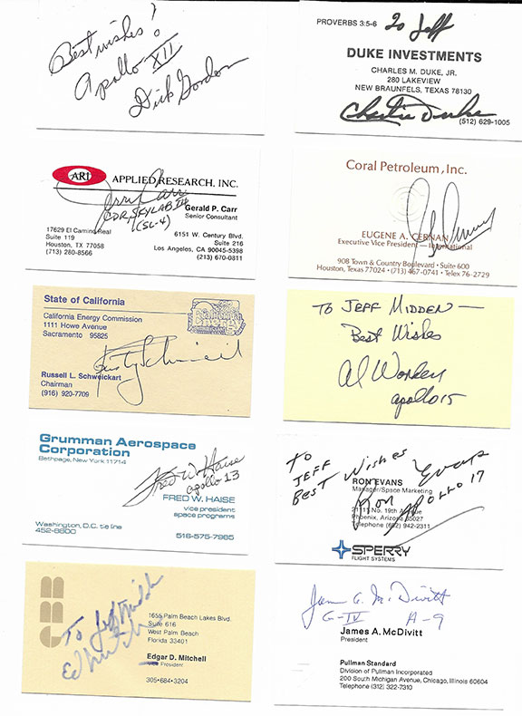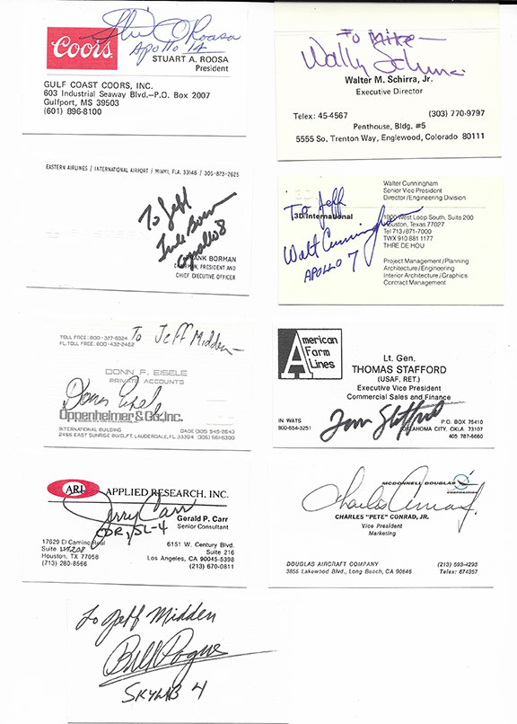 Rare Collection of 19 Astronauts on their Signed Personal Business Cards DUKE, Charlie (1935- ). Lunar Module pilot Apollo 16. 10th Astronaut to walk on the moon. GORDON, Dick (1929-2017). Command module pilot Apollo 12. One of 24 astronauts to fly to the moon CERNAM., Eugene (1934-2017). Apollo 17 mission. 11th astronaut to walk on the moon. WORDEN, Al (1932-2020). Command Module Pilot Apollo 15. One of only 24 to fly to the moon. SCHWEICKERT, Russell (1935- ). Lunar Module Pilot Apollo 9. The 1st crewed flight of the lunar module SCHIRRA Jr., Wally (1923-2007). In 1959, he became one of the original 7 astronauts. POGUE, William (1930-2014). Pilot of NASA’s Skylab 4 mission, longest manned space flight to that date. CARR, Gerald P. (1932-2020). Commander of Skylab 4. Part of an all rookie crew. STAFFORD, Thomas (1930- ). One of 24 astronauts to fly to the moon. CUNNINGHAM, Walter (1932- ). Lunar Module pilot Apollo 7. NASA’s 3rd civilian astronaut. ROOSA, Stuart (1933-1994). Command Module pilot Apollo 14. One of 24 astronauts to fly to the moon. EVANS, RON (1933-1990). Command Module pilot Apollo 17. One of 24 astronauts to fly to the moon. McDIVITT, James A. (1929- ). Commanded Gemini 4 and later Apollo 9 . CONRAD, Charles (1930-1999) Commander Apollo 12. Third astronaut to walk on the moon. HAISE, Fred (1933- ). Lunar Module pilot Apollo 13. One of 24 astronauts to fly to the moon. MITCHELL, Edgar (1930-2016). Lunar Module pilot Apollo 14. 6th astronaut to walk on the moon. BORMAN, Frank (1928- ). Commander Apollo 8. 1st to fly around the moon. EISELE, Donn (1930-1987). Command Module pilot Apollo 7, fired by NASA. A fabulous collection of 19 personal signed business cards, two by Gerald P. Carr, nine inscribed. Several astronauts have added the name of the flight they were on. All 19 signed cards are in very fine condition.......................$650.00 ![]() |