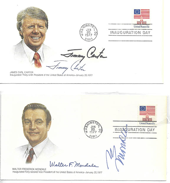 24) CARTER, Jimmy (1924- ). 39th President of the United States. (1977-1981). One of his major accomplishments was to help negotiate peace between Israel and Egypt. Wonderful Inauguration Day Cover, bearing a color portrait of Jimmy Carter. Affixed to this cover is a U.S. 13 cent American Flag postage stamp, cancelled Inauguration Day, Washington, Dc Jan 20,1977. Boldly signed with a vintage full signature of Jimmy Carter above his printed signature. Walter F. Mondale (1928-2021). Forty-second Vice President of the United States. This is a matching cover to the one above bearing a color portrait of Walter Mondale. Affixed is a U.S. 13 cent postage stamp cancelled Inauguration Day, Washington, DC Jan 20, 1977. Boldly signed with a vintage signature of Walter Mondale. Together with a COA from a high profile autograph auction house in New Hampshire. Both covers in Mint condition..........$265.00