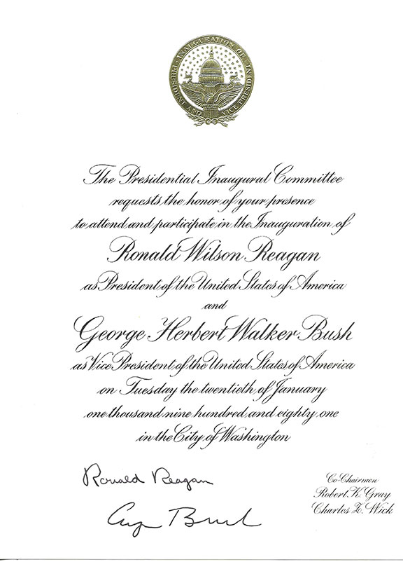 BUSH, George H.W. (1924-2018). 41st President of the United States (1989-1993). Vice-President under Ronald Reagan. Wonderful invitation to attend and participate in the Inauguration of Ronald Reagan as President and George H.W. Bush as Vice-President of the United States. January 20, 1981. Signed by both. Signed in the presence of Senator Mark O. Hatfield at the request of Stephen Koschal. Together with a C.O.A. from Todd Mueller Autographs. Koschal drove to Washington in March 1981 to pick up this treasure and other items from Senator Hatfield. Photo, not included, is Koschal with Hatfield in his privae office after exchanging gifts and about to leave for lunch. In Mint condition...........$2450.00