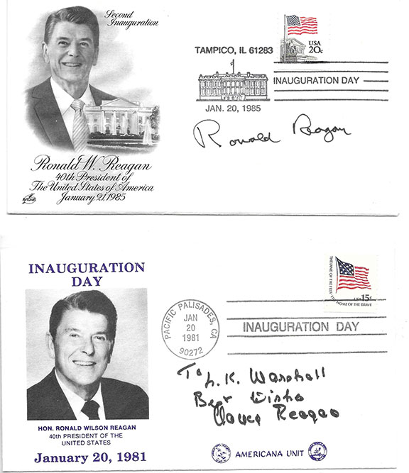 REAGAN, Nancy (1921-2016). First Lady (1981-1989). Second wife of Ronald Reagan. Inauguration Day cover bearing a portrait of Ronald Reagan, 40th President of the United States. Affixed is a USA 15 cent postage stamp cancelled Inauguration Day, Pacific Palisades, CA Jan 20 1981. Inscribed: "To L.K. Marshall Best Wishes Nancy Reagan." Both covers in very fine condition. Ronald Reagan cover comes with a C.O.A. from a high profile autograph auction house in New Hampshire........$1350.00