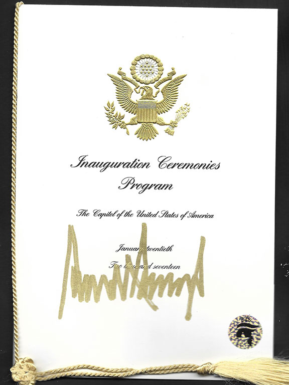 37) TRUMP, Donald J. (1946- ) Forty-fifth President of the United States (2017-2021) Very scarce original Inauguration Ceremonies Program The Capitol of the United States of America January 20th Two Thousand Seventeen. Headed with a fabulous, embossed gold seal of the president. Hand signed with his highly desirable full signature “Donald J. Trump” enhanced by using his equally desirable gold ink signature. Beautifully framed using a double floating mat. A lovely piece of eye candy. Together with an attractive ‘in person’ COA. Currently, anything signed relating to Trumps’ Inauguration with a vintage signature can be considered very scarce. Very recently another similar signed Inauguration Ceremonies Program signed in black ink was being offered for $4,200.00 by a dealer in Sanford, North Carolina. In Mint condition, our price...........$1100.00