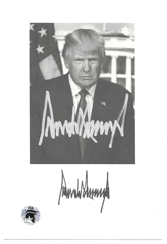 41) TRUMP, Donald J. (1946- ) Forty-fifth President of the United States (2017-2021) Official portrait of President Donald J. Trump which originally came from the package which contained the Invitation to the Inaugural Ceremony. Portrait, B&W, measures 4.5’x6” with overall size 6.5”x10”. Very boldly hand signed “with the desirable full signature “Donald J. Trump” using a silver ink pen. Facsimile signature printed below. Authentication sticker affixed to the bottom left. In mint condition..........$275.00