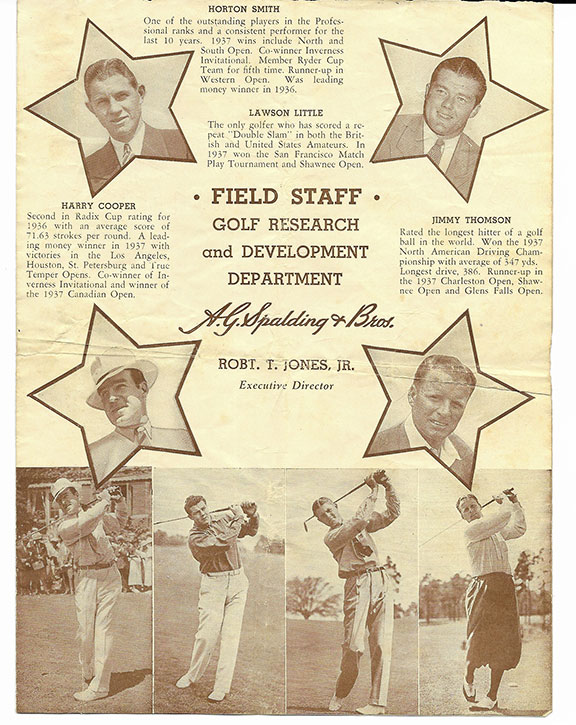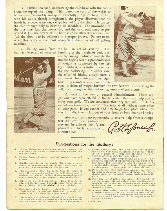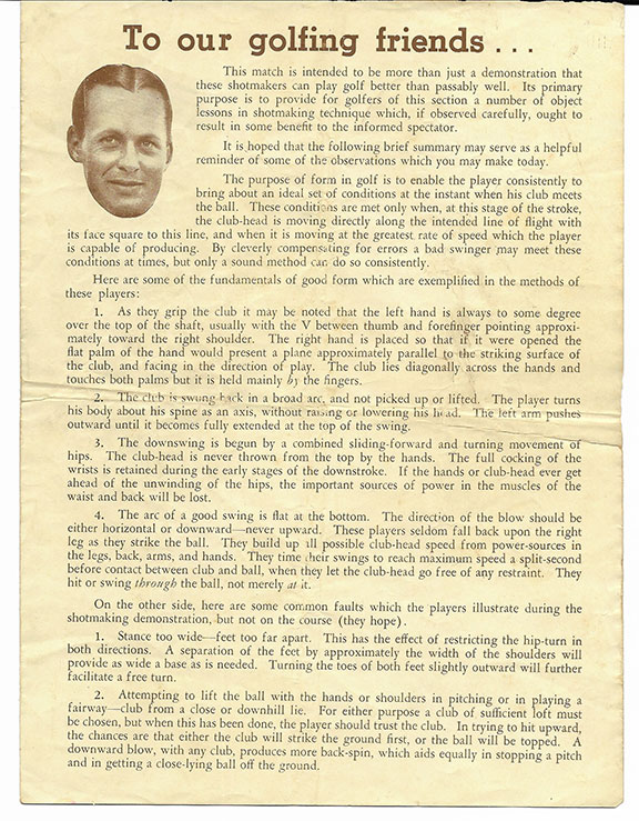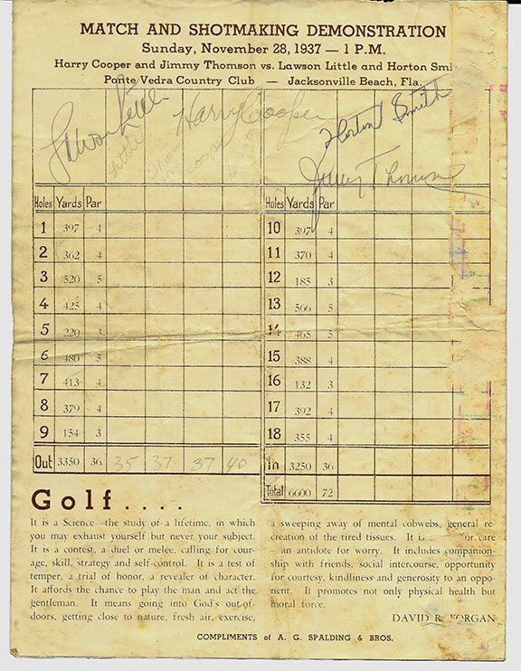 Vintage 1937 Signatures of the Four Best Golf Players in the World LITTLE, Lawson (1910-1968). Professional golfer enshrined into the PGA Golf Hall of Fame (1980). Died while only 57 years old. COOPER, Harry (1904-2000). Professional golfer enshrined into the PGA Golf Hall of Fame (1992). THOMSON, Jimmy (1908-1985). Professional golfer, he was noted as the longest hitter of a golf ball in the world. He won the 1937 North American Driving Championship. Appeared in the movie “The Caddy” with Dean Martin and Jerry Lewis and in “Shoot Yourself With Some Golf” with Ronald Reagan and Jane Wyman. Four page score card printed by A.J. Spalding for a Match & Shotmaking Demonstration to be played by the four of the best golfers in the world dated Sunday, November 28, 1937 at Ponte Vedra Country Club in Jacksonville Beach, Florida. Inside this pamphlet is 1.5 pages of fundamentals signed in print by Robert T. Jones. This contest was played by H. Cooper & J. Thomson vs. Lawson Little and Horton Smith. Page two contains a scorecard listing in pencil the final scores after nine holes of the four players. Little, shot 35, Thomson shot 37, Cooper shot 37 and Smith 40. Signed in pencil by all four. A very scarce combination of autographs seldom offered on the market. Signatures of Horton Smith are very scarce and are lacking in many collections of golf autographs..........$895.00 ![]() ![]() ![]() ![]() |