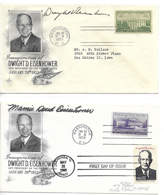 8) EISENHOWER, Dwight D. (1890-1969). 34th President of the United States (Jan 20, 1953-Jan 20, 1961). Very scarce Inauguration Cover January 20th, 1953 (First Inauguration) with a cachet of a smiling Eisenhower. Affixed is a U.S. 3 Cent postage stamp of The White House cancelled, Washington D.C. Jan 20, 1953. Beautiful signature of Dwight D. Eisenhower which graces the top center of the cover. Type written name and address of a collector in Iowa. Together with a matching cover cancelled twice. Once over a U.S. Supreme Court 3 Cent postage stamp, cancelled Jan 20, 1953, and the other over a U.S. Dwight Eisenhower postage stamp cancelled First Day of Issue May 22, 1986. Boldly signed with a 3.5” long signature of Mamie Doud Eisenhower. This cover bears the name and address, in pencil of a collector. Genuine signatures of Eisenhower are becoming quite scarce as new exemplars of his autopen signatures are discovered. An iconic pair! Both covers in fine condition. From the Estate of Ralph Swap of Alaska. ...........$675.00