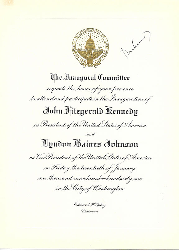 9) KENNEDY, John F. (1917-1963). 35th President of the United States (Jan 20, 1961- Nov.22, 1963). Choice Invitation from The Inaugural Committee to attend the Inauguration of John Fitzgerald Kennedy as President and Lyndon Baines Johnson as Vice President on January 20th 1961. Signed in ink by John Kennedy, as President during the ceremonies. On the verso, in pencil, is stated: “Purchased from John Jovich (noted presidential autograph collector) York, Pa. This item was personally signed by JFK for Congressman Michael J. Kirwan who was a long-time friend of JFK and a Regent of the Smithsonian Institution. Mike Kirwan was a next-door neighbor to John Jovich when Jovich lived in Youngstown, Ohio. Jovich purchased the Congressman’s collection. In V/F-near Mint condition. Can easily be considered Rare ..................................$6500.00