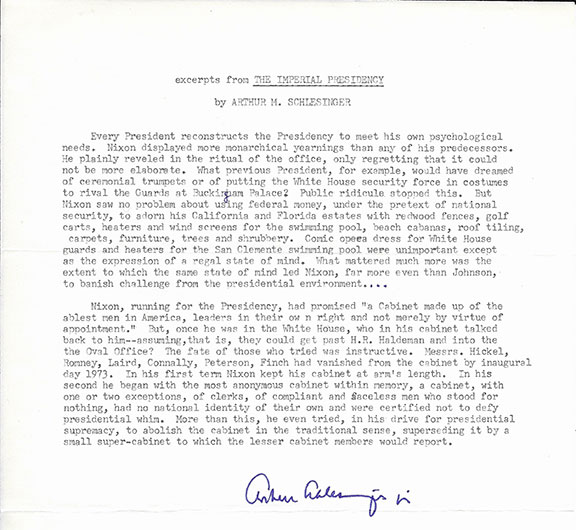 SCHLESINGER JR, Arthur (1917-2007). American historian, author of sixteen books. He was a special advisor to President Kennedy. He won the Pulitzer Prize for his book “A Thousand Days: John F. Kennedy in The White House’. Typescript signed, Excerpts from The Imperial Presidency. Two lengthy paragraphs about Richard Nixon and his time in The White House. Very interesting reading, possibly typed by Schlesinger because of some typing errors and one correction by his hand. Fine full signature.......................$39.00