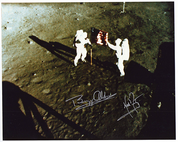 This is a Rare glossy photograph 10”x8” of Neil Armstrong and Buzz Aldrin erecting the American flag on the lunar surface. This photo was taken from a camera on the Lunar Module. NASA, [1969] This photograph shows Neil Armstrong and Buzz Aldrin raising the American flag on the Moon’s surface about 27 feet from Eagle. Buzz Aldrin stated that this Apollo Flag was blown over by the blast from the rocket exhaust during takeoff from the moon. Signed photographs of Armstrong and Aldrin on the lunar surface are considered rare. Signed by both Neil Armstrong and Buzz Aldrin using a silver ink pen. In mint condition............. $11,000.00