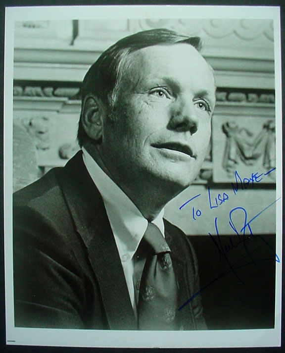 ARMSTRONG, Neil (1930-2012). American astronaut. Commander of Apollo II, he became the first man to walk on the Moon on July 20, 1969. Photograph, 8"x10", black & white, full face, close-up pose. Inscribed "To Lisa Maye, Neil Armstrong". A fabulous signature of Armstrong measuring over four inches long. The writing and signature shows much better contrast on the original. In very fine condition. $1750.00 |