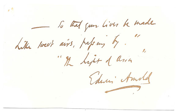 Honored with Decorations by the Rulers of Japan, Persia, Turkey and Siam ARNOLD, Sir Edwin (1832-1904). English poet. Knighted in 1888. Best known for his work “The Light of Asia.” Autograph quotation signed on a 4”x7” slip: “--So that your lives be made like sweet airs, passing by The Light of Asia.” Boldly signed ‘Edwin Arnold.”.............................$125.00 |