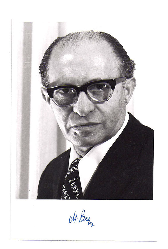 BEGIN, Menachem (1913-1992). Early Zionist leader who rose to Israeli Prime Minister (1977-1983). He signed the Peace Treaty with Sadat of Egypt (1979), the first peace treaty between Israel and an Arab Country. Signed photograph, B&W, 3.5”x5”, bust portrait, signed “M. Begin” in blue ink in the bottom margin. Choice condition...........................$135.00![]() |